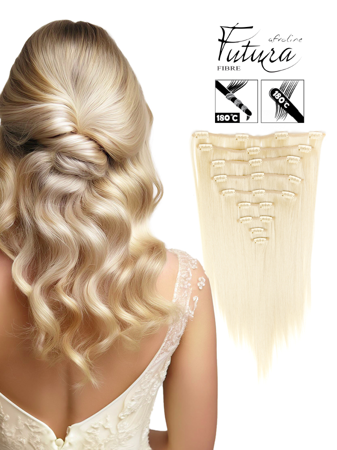 A FUTURA CSATOS PÓTHAJ SZETT, egy göndöríthető és vasalható szintetikus csatos póthaj. Alkalmi frizura, esküvői konty, báli egyedi hajviselet, késztéséhez, rendezvényekre, divatbemutatókra ajánljuk. A mindennapos hordásra is alkalmas.